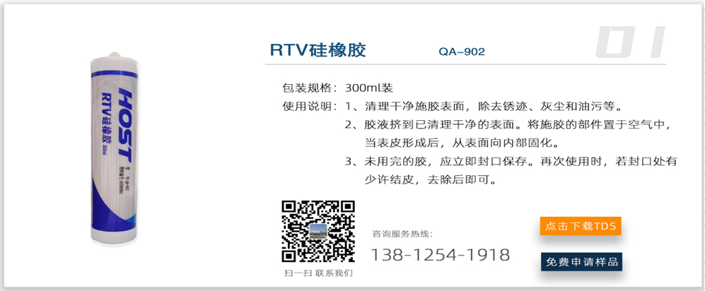 RTV硅膠(室溫硫化型硅橡膠)作為粘接、密封、絕緣、防潮、防震材料,廣泛應用于電子元件、半導體材料、電子電器等設備的粘接、密封,電加熱器、電子儀表的防水、密封及電子元件的灌封等。具體如電加熱末端的密封、小馬達磁瓦和金屬外殼的粘接、汽車車燈、光學儀器和鏡頭的粘合密封、電子儀表外殼的粘合、電機的絕緣保護、電子元件的粘合密封等。RTV硅膠具有良好的粘接性能,固化物電氣絕緣性能優良,具有防潮防震功能。無毒、無污染、無腐蝕。具有良好電絕緣和抗電弧性能,耐老化、防潮,有良好的粘接性能。適用于—60℃~200℃工作溫度。